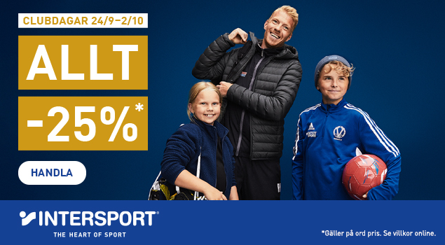Mellan den 24/9 - 2/10 har vår samarbetspartner Intersport 25% rabatt på allt i butik och på intersport.se, ett perfekt läge att köpa det ni behöver för höstens alla aktiva dagar.