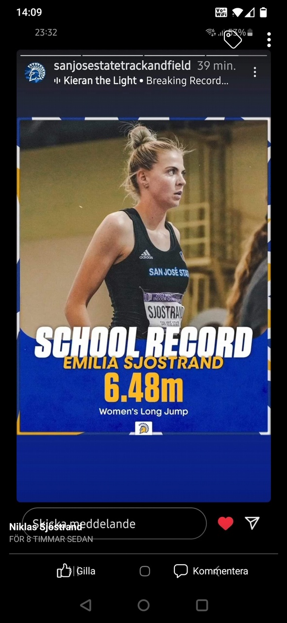 Emilia, nytt personbästa i längd på 648. Det gör att hon nu även klarat kvalgränsen i längdhopp till Junior EM i sommar. Tidigare klarad gräns i tresteg är också klarad, dessutom flera gånger. I tresteg har hon hitintills hoppat 13.37. Båda är förstas nya klubbrekord i Hellas.