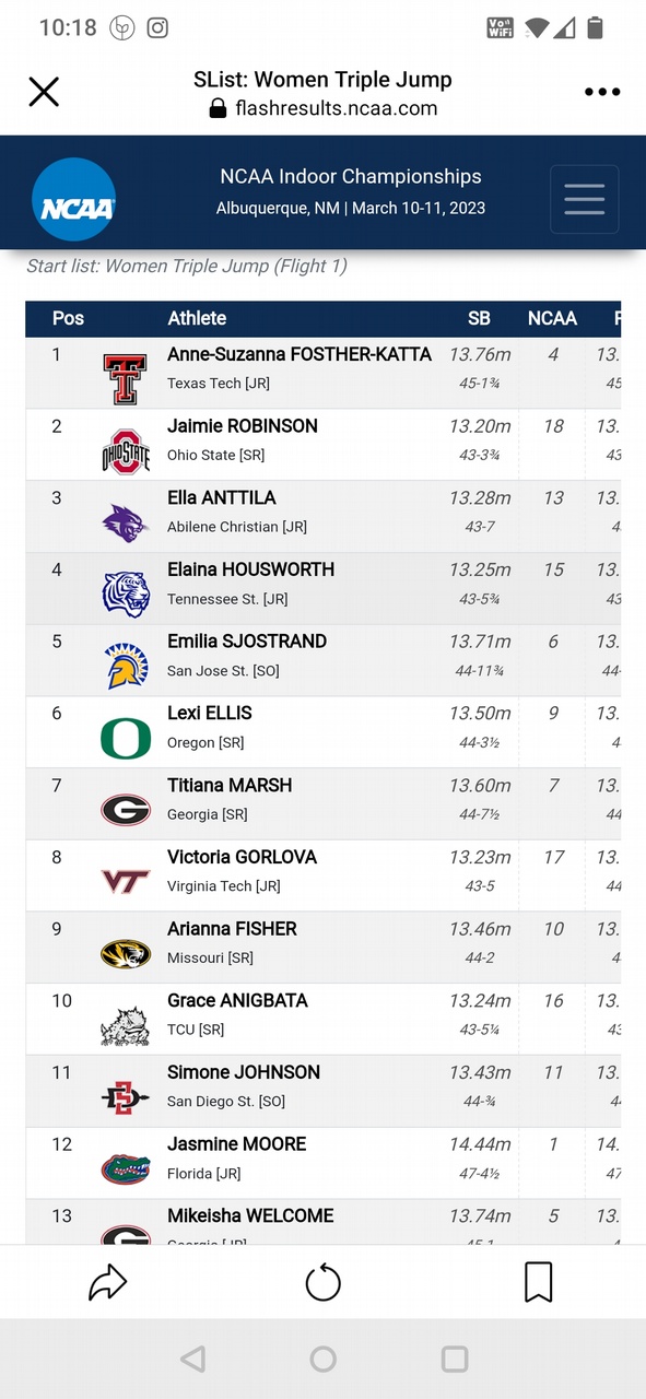 Hon möter tufft motstånd i bland annat av längdsegrarinnan Jasmine Moore som hoppat 14.44.